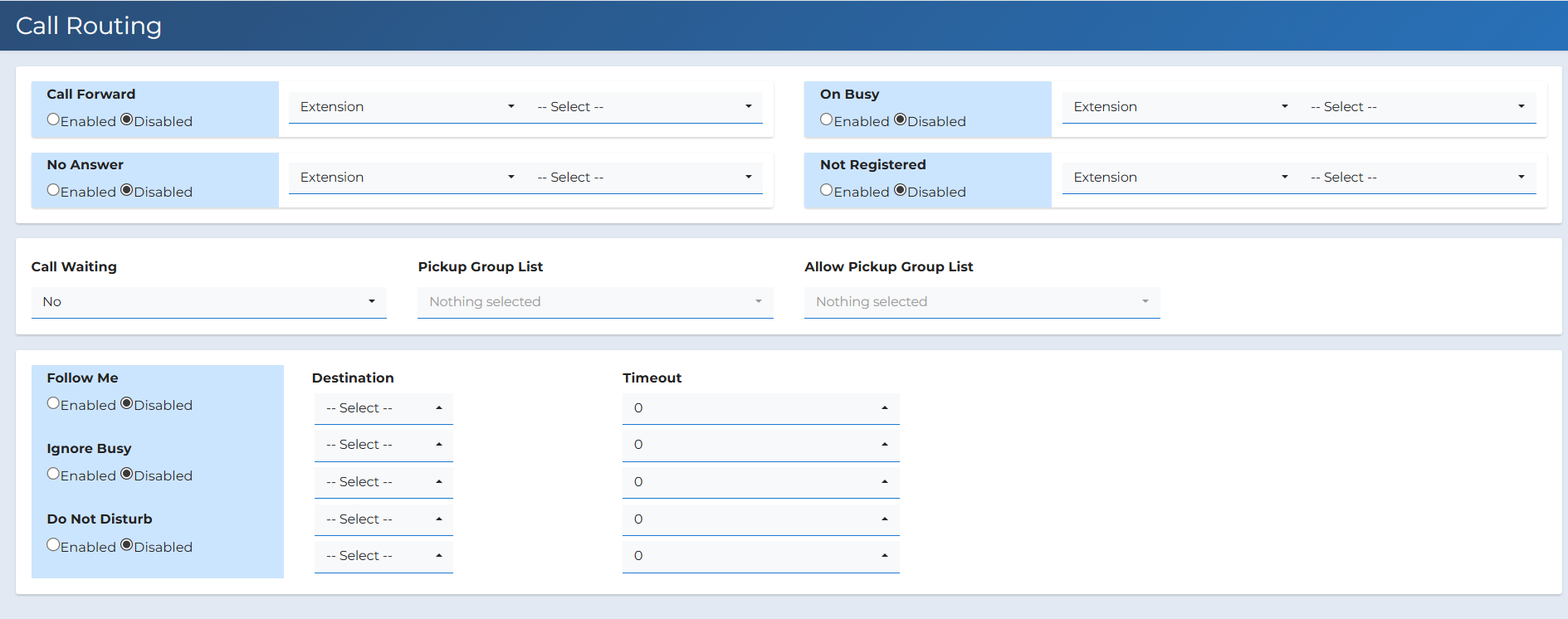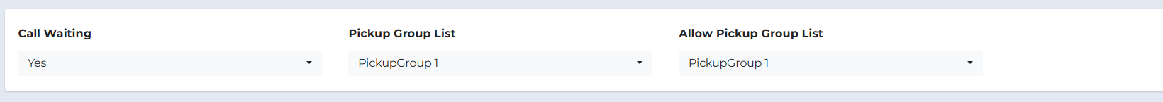 – Call Waiting: Yes – Pickup Group List: select the group this device belongs to – Allow Pickup Group List: select the group(s) allowed to pick up this device’s calls