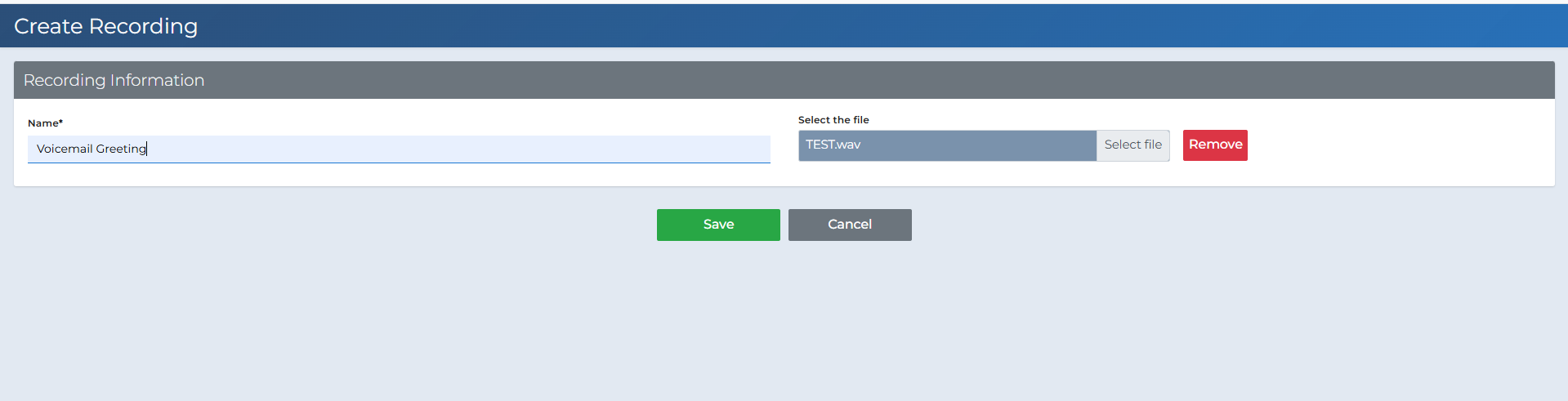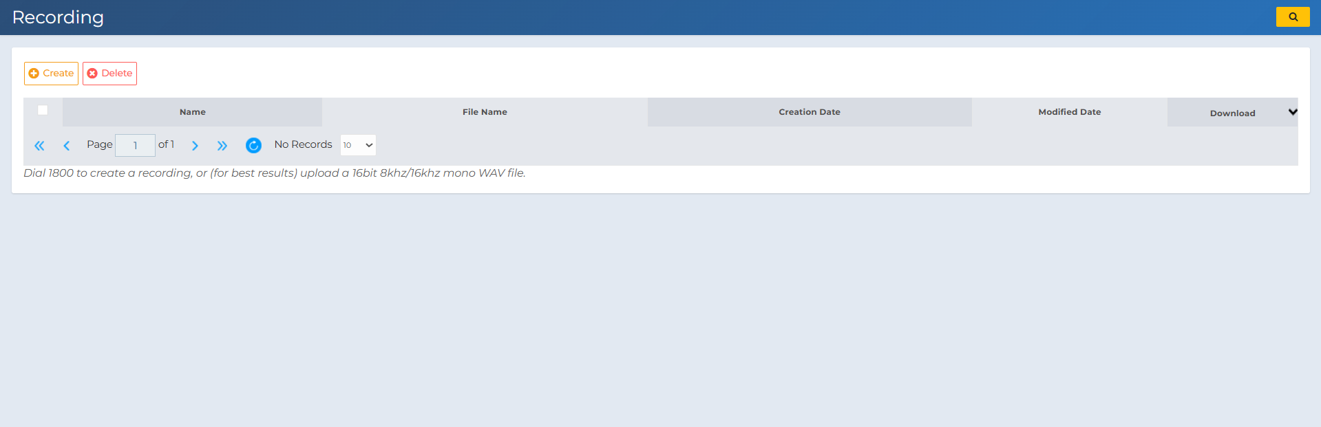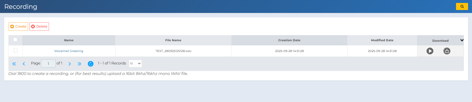 Step 2: Recording ListOn this page you can see all uploaded recordings. Use Create to add a new recording or Delete to remove one. Optional: You can also dial 1800 from a SIP device registered to your account to record audio directly. For best results, upload a WAV file with 16-bit depth and 8kHz/16kHz sample rate in mono format. WAV: A common uncompressed audio format. Bitrate (16-bit): Defines sound resolution/quality. Sample rate (8kHz/16kHz): Number of samples per second. Mono: Single audio channel. You can check for those under file properties, and in the software you use for recording. |