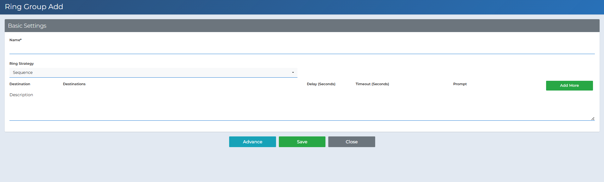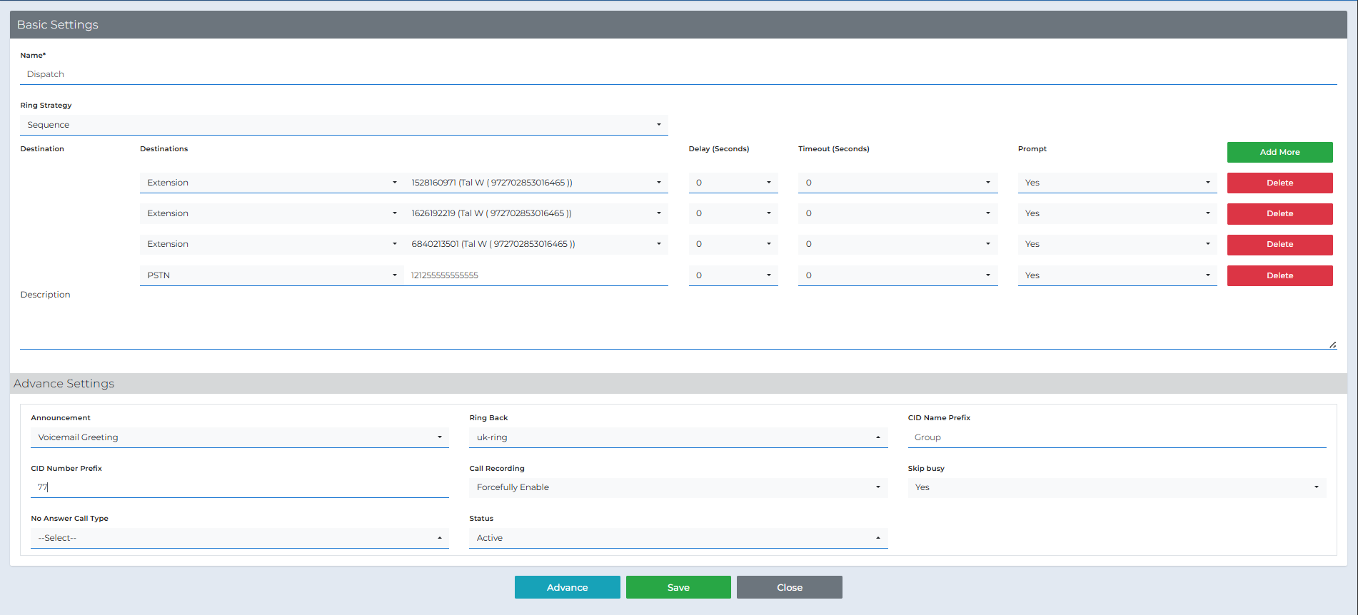 Step 4: Configure Advance Settings (optional)Announcement – Audio played before ringing (e.g., Voicemail Greeting). Ring Back – Ring tone/music heard by the caller while members ring. CID Number Prefix – Short code added before the caller’s number (e.g., 77). CID Name Prefix – Text added before the caller name (e.g., Group). Call Recording – Enable/Disable/Force settings for this group’s calls. Skip busy – If Yes, skip members whose device is busy. No Answer Call Type – Where to send the call if no one answers (e.g., Voicemail, Queue, IVR, etc.). Status – Active/Inactive. |